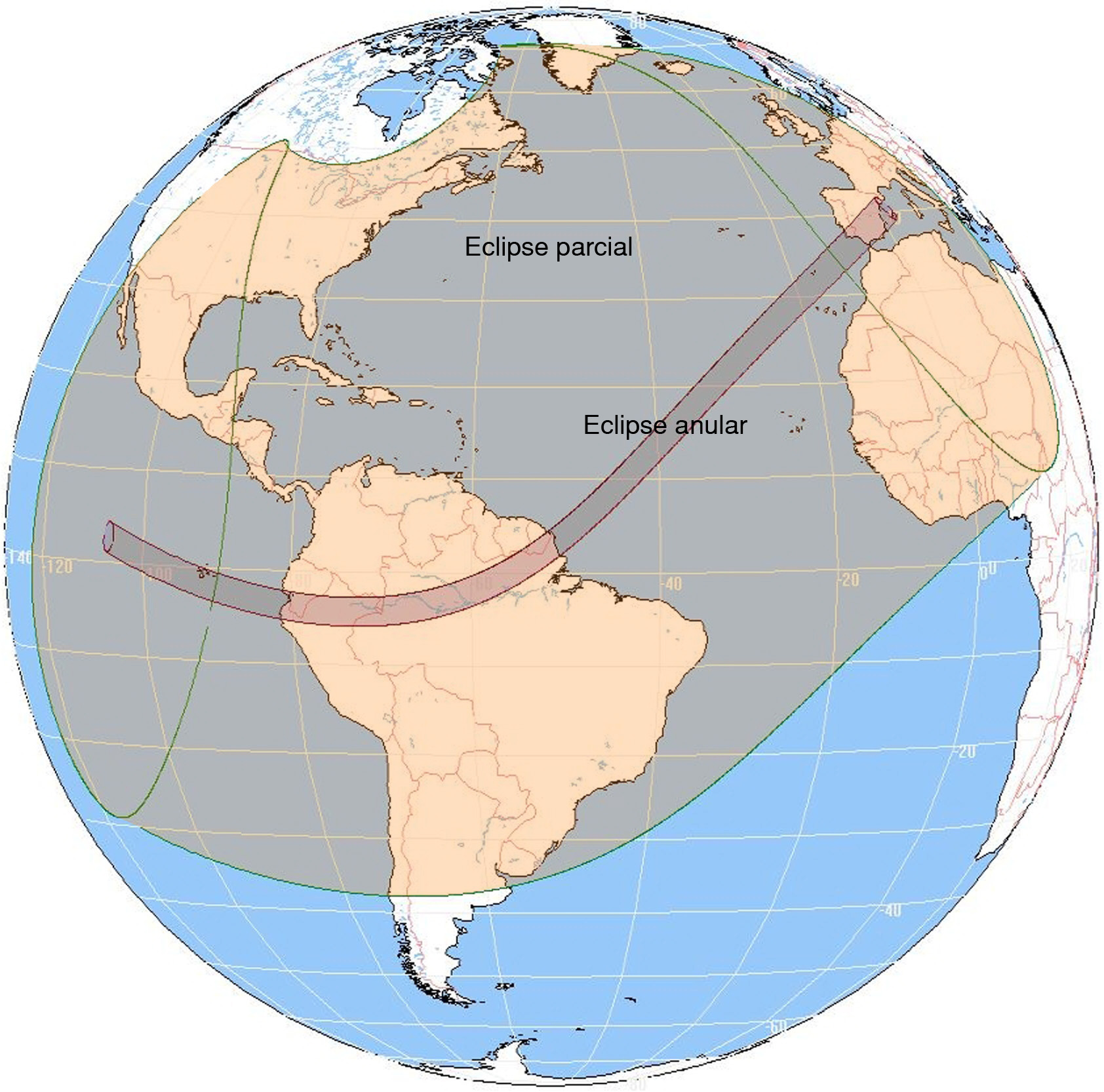 La franja de anularidad del eclipse comenzará en el océano Pacífico, y atravesará después gran parte de América del Sur (Ecuador, Perú, el extremo sur de Colombia, Brasil, Surinam y Guayana Francesa), para adentras después en el océano Atlántico antes de llegar a Portugal (entrando primero por las Islas Azores) y terminar en España. Por otro lado, la zona de parcialidad cubrirá también América Central, gran parte de América Norte y Sur, la zona sur de Groenlandia, la zona más occidental de Europa y también algunas regiones del norte de África.