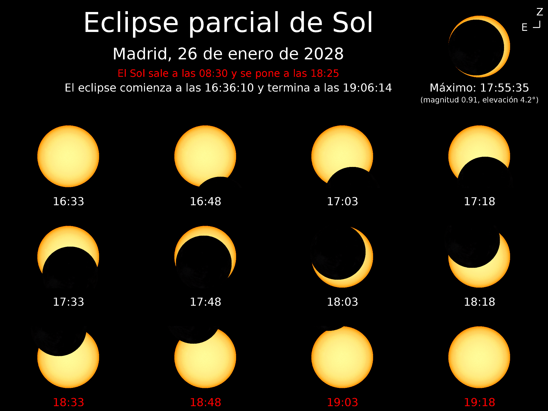 La siguiente animación muestra el recorrido completo del eclipse. Los tiempos corresponden a la hora oficial peninsular en la fecha considerada.